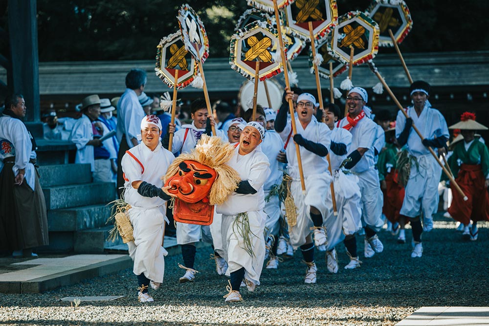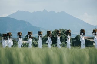 お供をするのは、全身白装束の女性(宇奈利)など、約200人の行列です。行列が進む間に田歌が謡われ、2カ所の御旅所に立ち寄ります。ここでは、稲を神輿の屋根に向かって投げ上げる田植式が行われます。