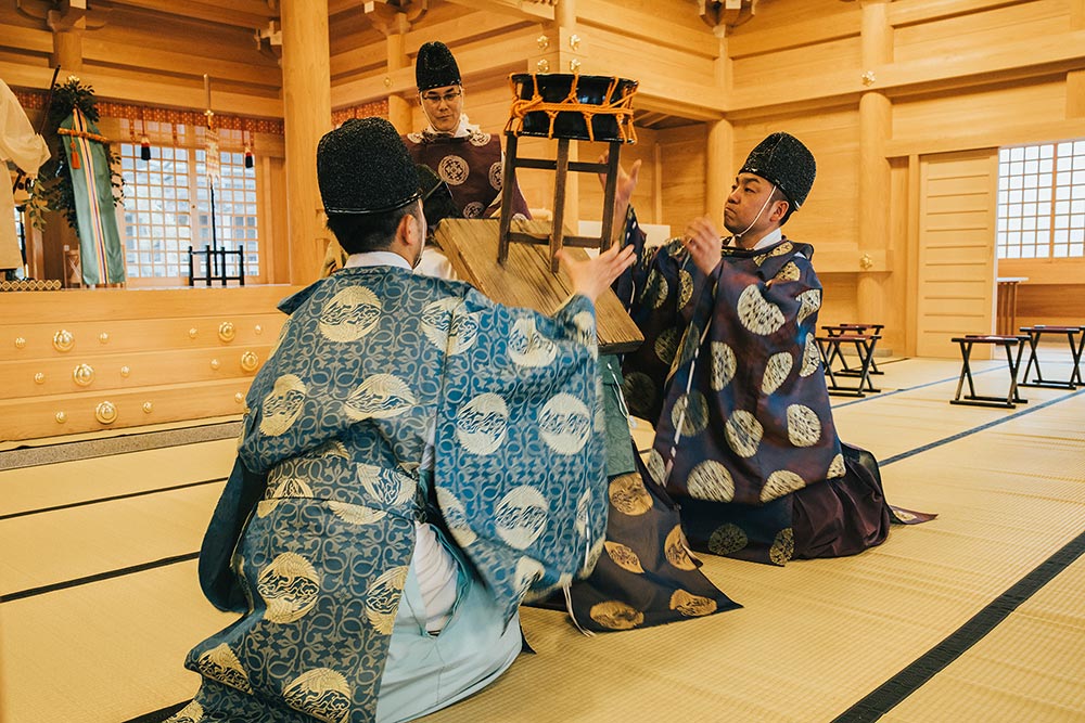 田作祭は、社家の祖先神でもある国龍神(年祢神)の婚儀を表現し、そのことで五穀豊穣を願う内容となっています。